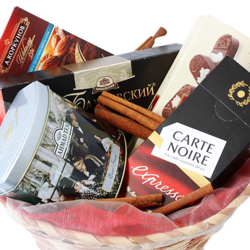 Состав: Бабаевский трюфель, Чай Ахмад ЭрлГрей, Кофе Эспрессо, шоколад коркунов, Палочки корицы, шоколадный бисквит, корзина, декор.