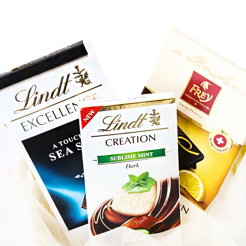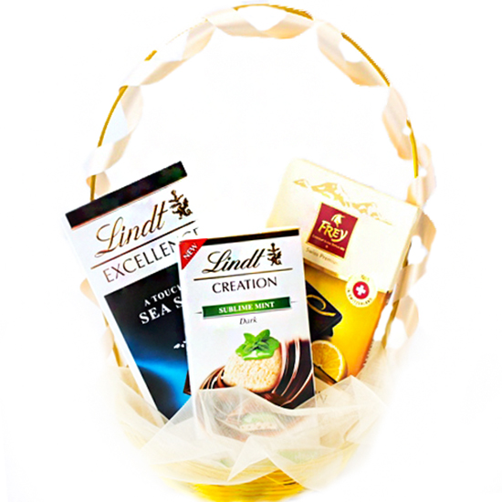 Состав: Шоколад Lindt темный со вкусом мяты и какао,Шоколад Frey горький со вкусом лимона и перца, Шоколад Lindt горький с морской солью, корзина, декор.