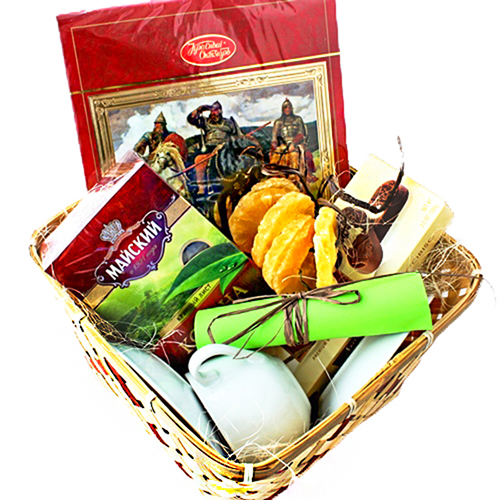 Состав: корзина, чай Майский, конфеты Третьяковская галерея, 2 чашки с блюдцем, ананас сушеный, бисквитные печенья, поздравление с днем ВДВ.